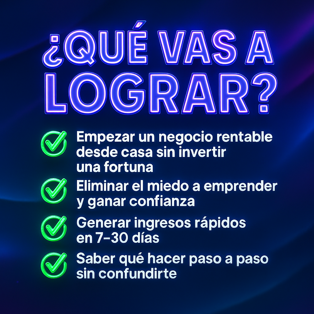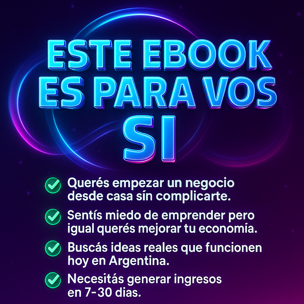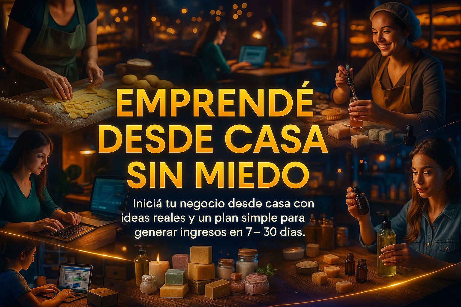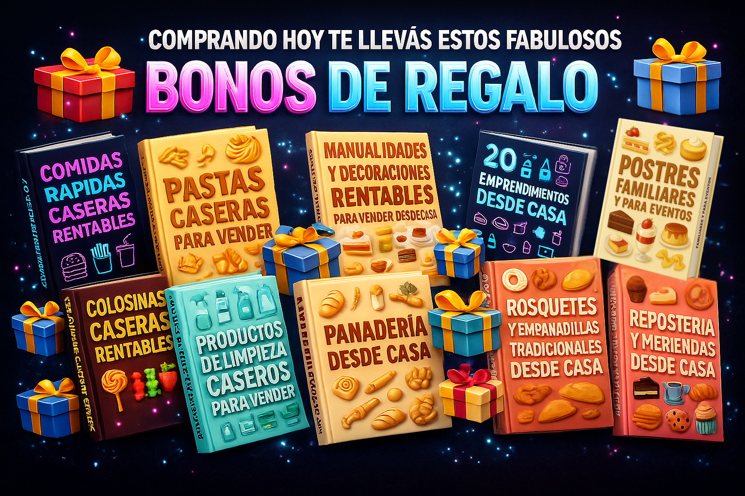 Incluye más de 20 ideas reales de negocios que podés iniciar desde casa, explicadas paso por paso, junto con bonos exclusivos, ejemplos prácticos, guías rápidas, listas de materiales, métodos de venta y estrategias simples para empezar sin complicarte.